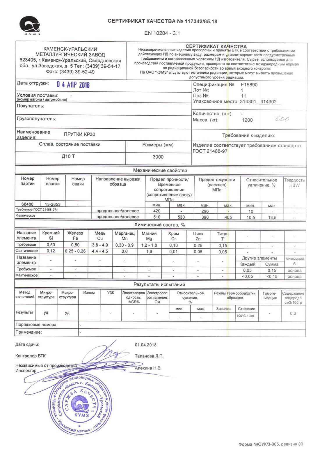 • Пруток Д16 – естественно состарен, пластичен, легко поддается резке. Обладает низкой коррозионной стойкостью при Т>80 °С, нуждается в защитном эмалевом покрытии или анодировании.